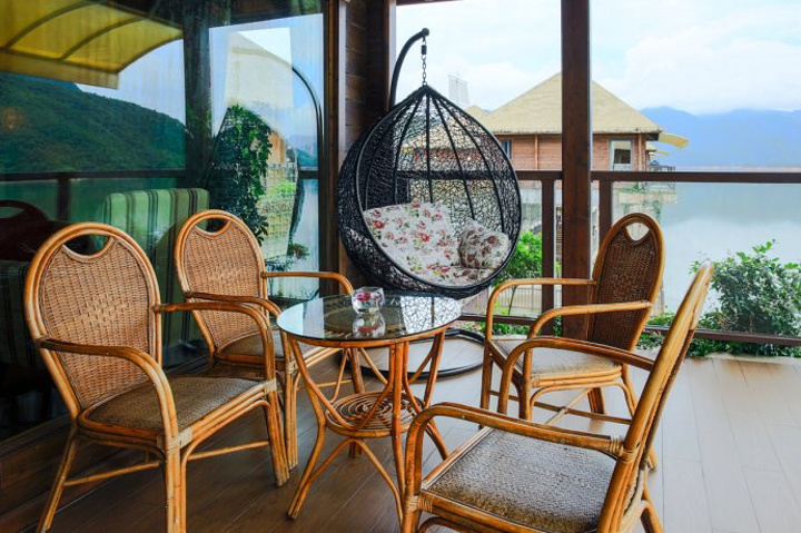 木屋别墅有独立的阳台,放有四把座椅和一把藤编的鸟巢吊椅。夏日里,吹着微风,做在摇椅上休息。或者约上三五好友,坐在湖中的木屋阳台,一起喝茶赏景色,便是最惬意的夏天。