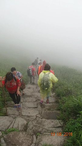 向导把我们送到山上这家驿站,吃完早饭他就下山了,距离金顶还有一个多小时的路程,但是没有什么岔路。山上的这些食物都是人用扁担一步一脚印挑上来的,所不杜绝浪费,当然这四盘素菜也花了170元,好吧,没有的向导我们休息片刻依然独自前行。越往上走,山上的雾也越来越大,衣服头发全是湿的,幸好在向导家我们有买雨衣备用。