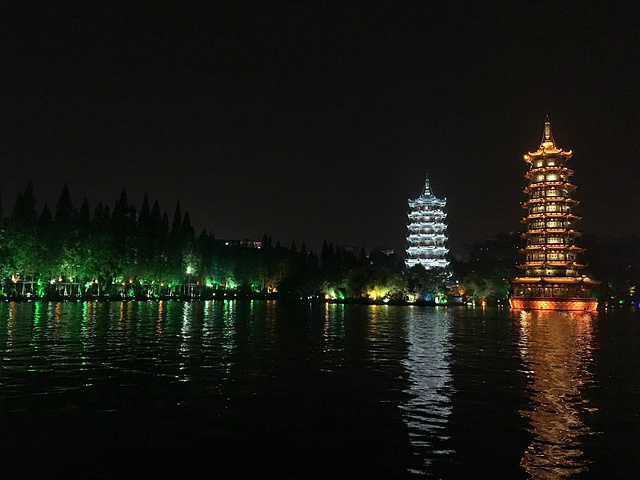 从象鼻山出来我们就走去日月双塔了,日月双塔竟然也有门票要买!这个我们觉得完全没必要咯,在外面的小路上围着走一圈都已经很好的看到了,都不知道为什么要门票进去,这里也有船可以坐的,我们还是觉得没必要,大家如果有闲钱就坐吧...日月双塔我们是打算看夜景的,晚上比白天好看多了,所以就直接走去步行街打算吃个饭再来,然后呢,对于我们广东妹子来说,这步行街实在是没啥好逛的。。。吃了个田螺姑娘(味道实在一般)找了个咖啡店坐下休息,看天黑了就走回去日月双塔了...