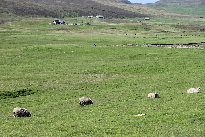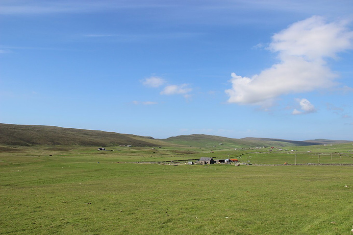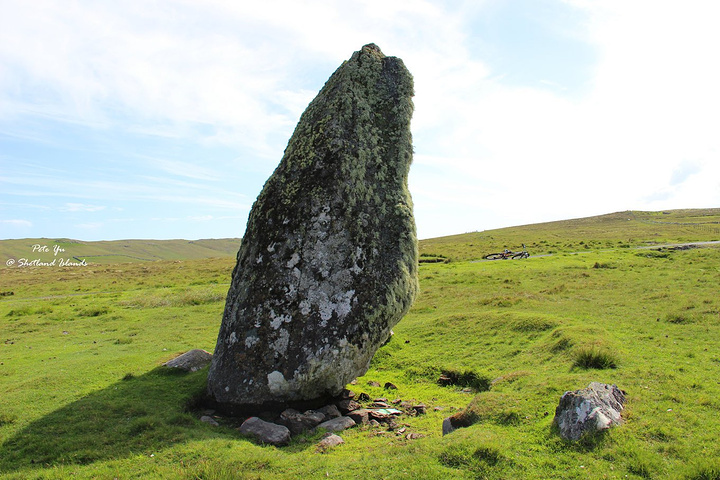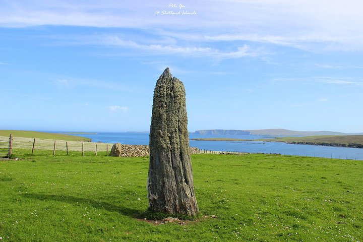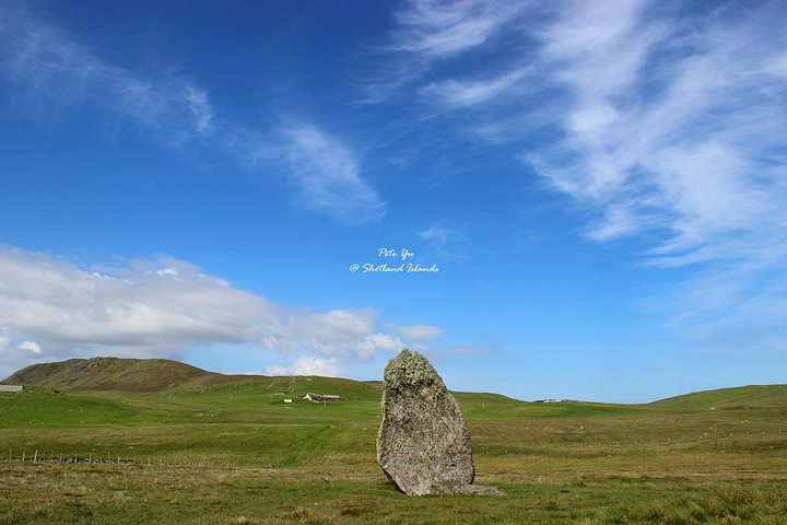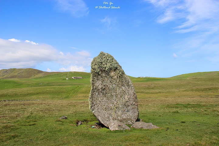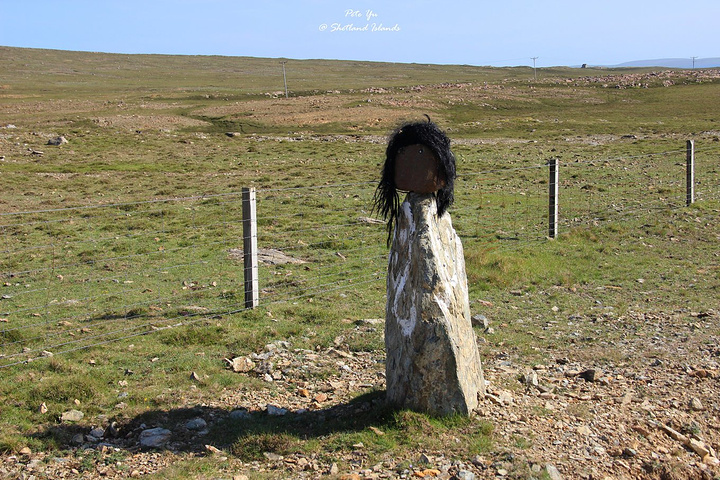 按照导游图及Google Map指示,出发俩小时后从主路右拐进入恩斯特岛的西半边辅路,再骑行10分钟,爬上爬下约2个小坡,根据导航再左转进入小路就可以看到恩斯特立石了。依然查不到关于此石的中文介绍,恩斯特旅游介绍里大致是整个设得兰群岛最大的立石了,时间约为2000年前,依然是维京文化的遗迹。