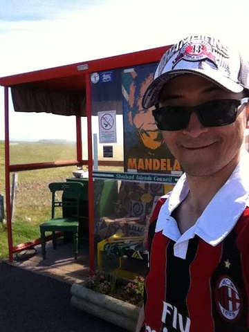 米兰死忠表示征服世界最孤独公交车站!这件球衣在英格兰不敢穿怕被足球流氓K,好不容易捱到偏远群岛才拿出来。事后在爱丁堡还有不少人朝我欢呼米兰并鼓掌,看来现在我米虽沦为米屌,人气还是不少啊。