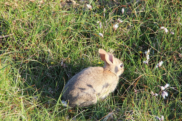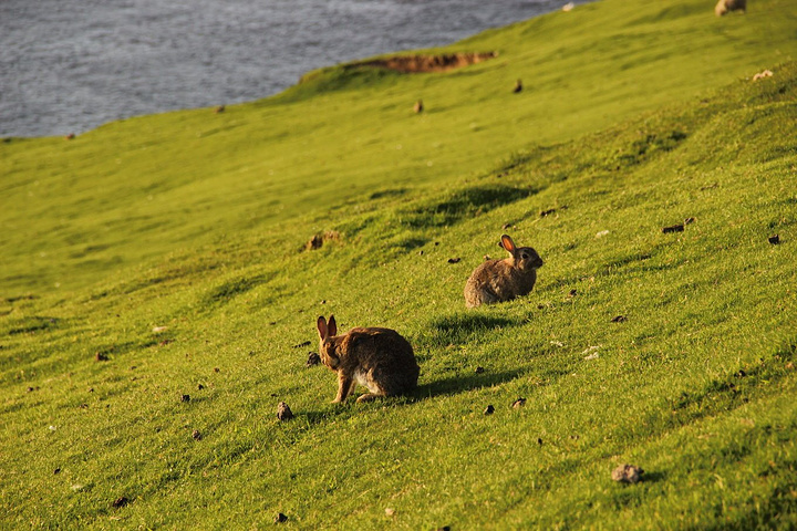 越往北走,经过了几个连续坡度之后有些小累,根据Google Map指示已经来到了悬崖的最北点,这时前面出现一个向下的断层,远观貌似一直延伸入大西洋,顾不得吃力一路冲下去,那个著名的灯塔及礁石便展现出全景。坡上的野兔天天能享受这样的美景。