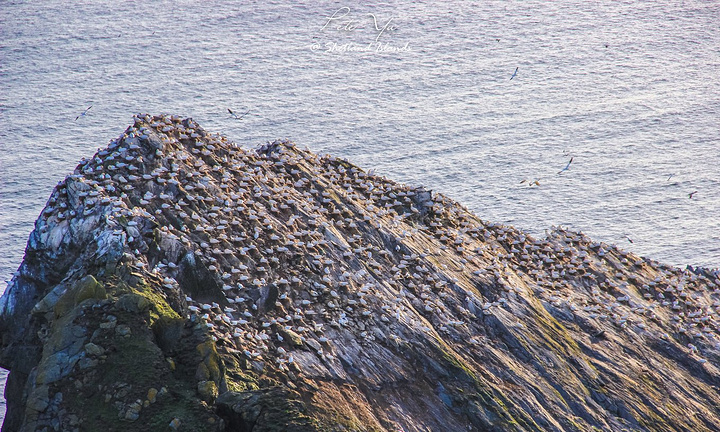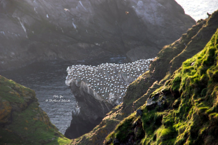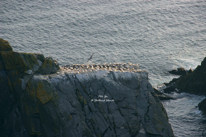 北方塘鹅Gannett,体型大,长100公分(40吋);繁殖于格陵兰、冰岛、法罗群岛、设得兰群岛等北大西洋岛屿,越冬于墨西哥湾、摩洛哥和地中海。设得兰群岛的赫马岬保护区,乃是其最大的栖息地之一,在这片区域的徒步过程中,有幸看到了庞大的群落,数量之大令人震撼。