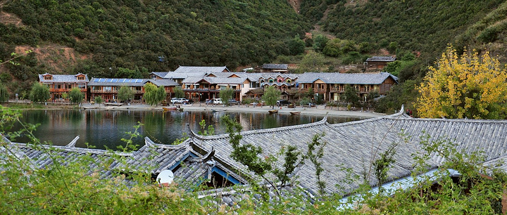 这里应该是泸沽湖最早开发的地方了吧,是大落水吗?有很大的视野,有一大块观景和买卖生意的大平台,有很多大巴、游客和游船。