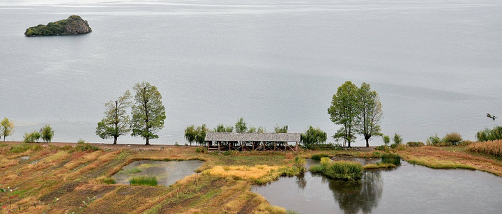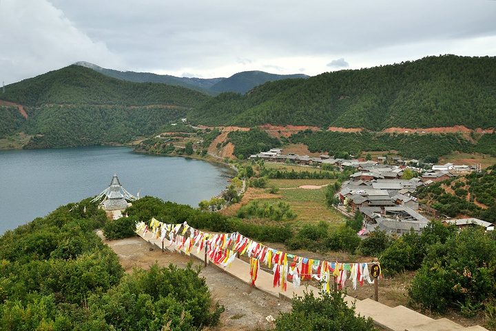 上午9点,我们开始出发环湖,阴天,光线柔和,风儿微漾,感觉非常舒适。从里格岛沿着柏油路往山上绕,一小会,来到这第一个不知名的景点,沿着许愿路往下走,至小塔台,可以看到下方的里格半岛和湖面。图片右边便是我们昨晚住宿和逗留的地方。