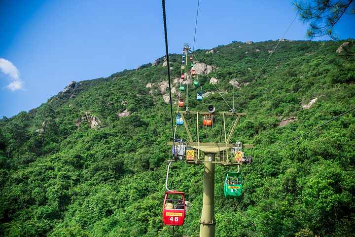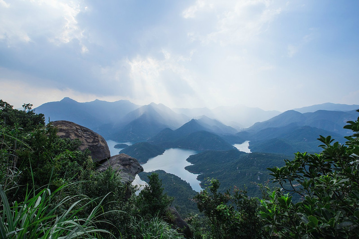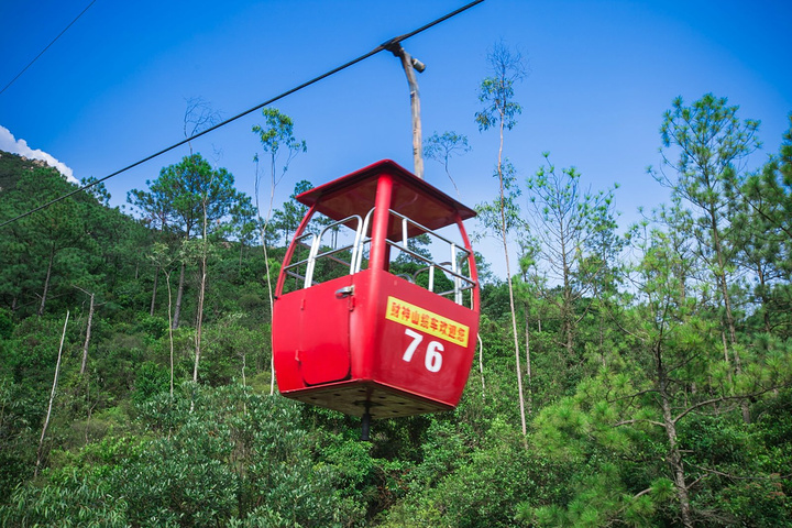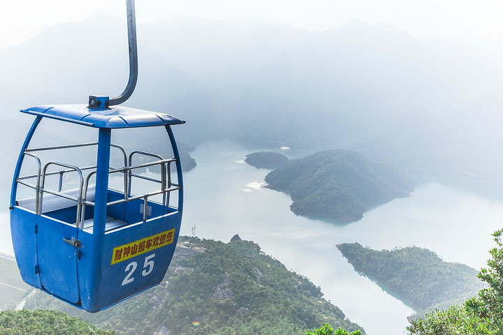 上下财神山都需要坐缆车,两个人一辆。从山脚底下坐上去大概15分钟左右,五颜六色的缆车在绿树环绕的山林间穿梭,画面很美,特别是在快到山顶的时候,缆车队伍呈现45度向上的角度,这个时候往前看非常的好看,童话世界既视感, 下缆车的地方差不多就是山顶了,也有楼梯再往上走一点,上面有好几个观景台,可以俯瞰整个水库,那天运气很好,遇到一束光,呈伞状射下来。
