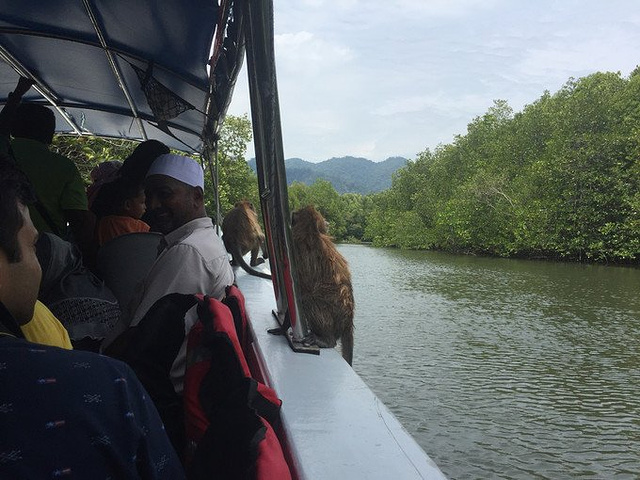 然后来到一处森林比较繁盛的地方,树上有小猴子,它们会跳到船上来。船长向我们要了两个空瓶子,放在船顶上,都被猴子上船给搜刮走了。