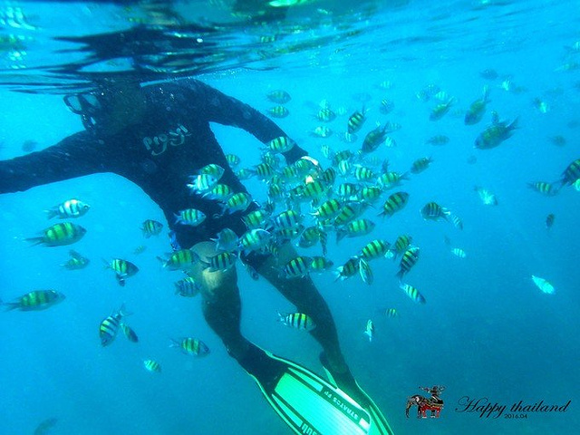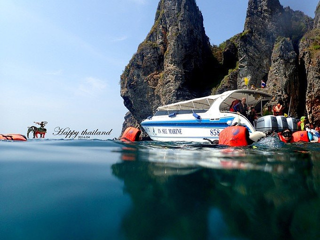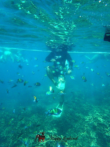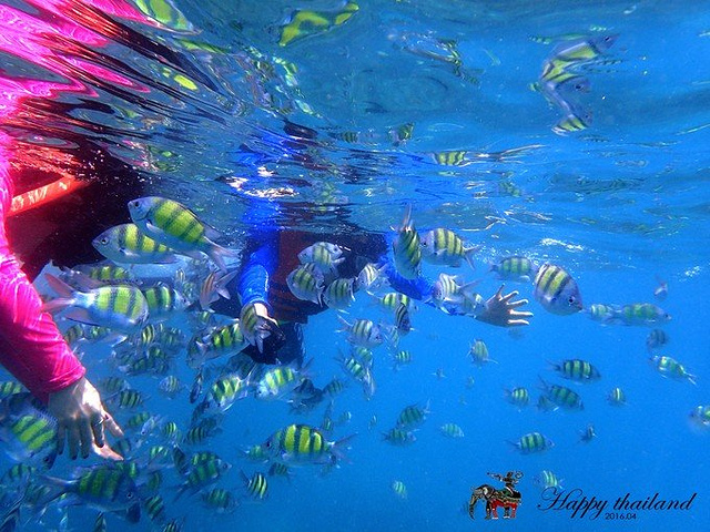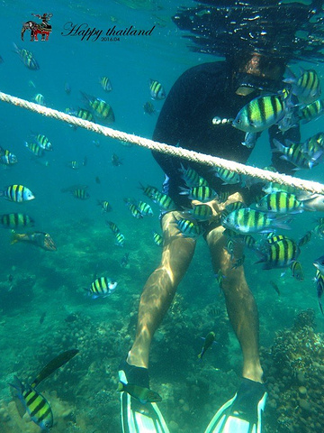 一到码头导游就让签到换泳衣,手上还给贴上该团的标签,吃完早餐导游开始讲解今天的行程和注意事项,无聊来拍一拍。。。。怕晒黑的妹纸请备好潜水衣,我觉得相当实用,防晒摸得太麻烦啦,而且导游说没什么效果还会毒死海里的鱼。。。对了,导游在泰语里是乌龟的意思,所以大家都不叫导游,叫“教练”