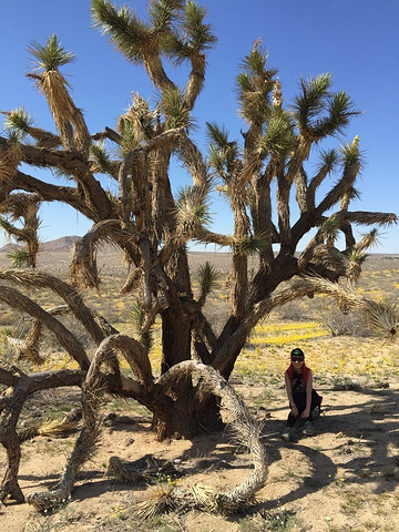每年2月至5月春季期间是野花盛开的季节,我们去的时候正直4月初,满山遍野的小黄花簇拥着与它程鲜明对比的沙漠灌木和Joshua Tree, 美得别有风情:温馨的沙漠戈壁。