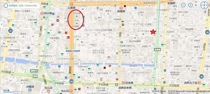 图中红色星星的地方就是大阪心斋桥鲸鱼酒店 (Grampus Inn Shinsaibashi), 离长堀桥地铁站(Nagahoribashi Subway Station)8分钟步行,离日本桥地铁站(Nippombashi Station)10分钟步行。图中红色圈圈的就是心斋桥大丸百货,步行也只需十分钟,今天逛街基本就在里面和附近的小店,基本药妆和大牌化妆品都可以买得到。