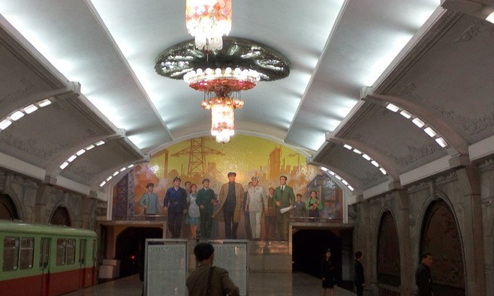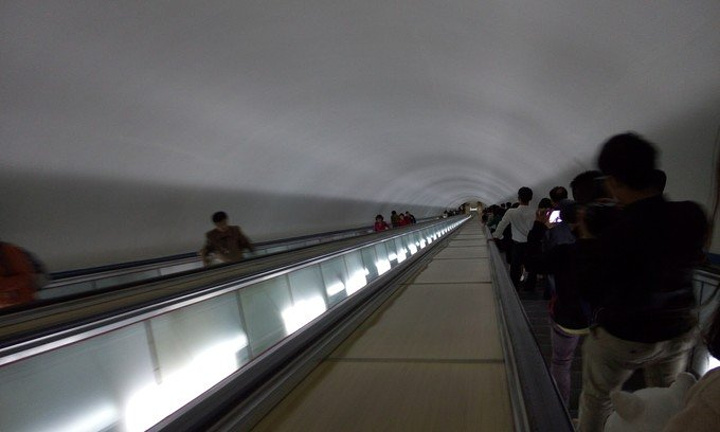 有轨电车、无轨电车、公交车和地铁是平壤的四大交通工具。前两者我在很小的时候坐过,后来随着城市的发展渐渐都消失了,在我的家乡,有轨电车叫摩电,无轨电车叫大辫儿。去之前在游记中都有关于平壤地铁的介绍,对于车站、设施、布景之类的都已经熟悉了,唯一不熟悉的就是感觉了。当我真正站上通向地铁的电梯里,我的腿在不由自主的抖~~这也太深了,站上去几乎看不见底,好吓人的说。