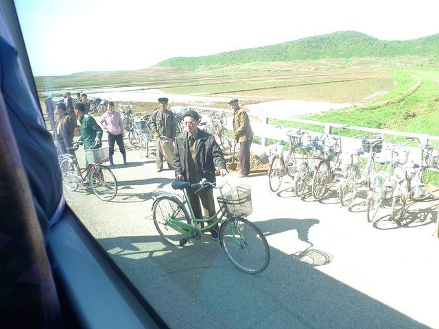 可能在我们看来,这旅途略艰辛了点,可以如果你看到朝鲜人看到火车和汽车时那种好奇、期待、羡慕的眼神,就会觉得生活还是很幸福的感觉。特别是在火车上,路过的地方,无论男女老少、高矮胖瘦,无论人们在做什么,无一例外会停下手中的活儿,一路目送火车走远。有顽皮的小孩子,还会天真的跟火车招招手,但当我们反招回去时,他们更多的是不好意思了。进入朝鲜的火车上,一个老奶奶给我的印象很深,她站在离火车不远的地方,上下挥动着手,我觉得她不是在招手,而是企盼火车可以停一停,听说朝鲜人是不可以随意自由走动的。还有在去妙香山的路上,一个小男孩穿着兰制服,顶着一张黑黑的只有嘴周围是白的小脸,呆呆地站在“高速公路”边,看着我们经过,眼神里是无限的向往和怯懦,那个眼神至今留在我的脑海里无法忘怀。