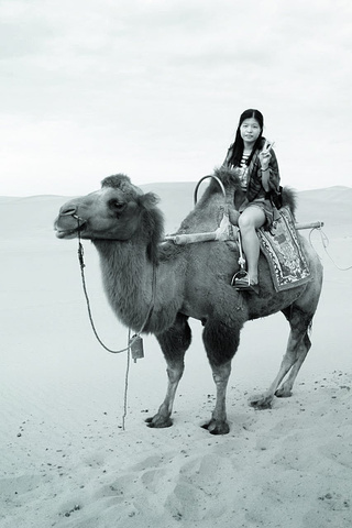 我自告奋勇要求骑在队伍最前面,后来才知道我骑的是骆驼队里的头头,特别高大威猛,还戴着驼铃,一路上咚咚咚地响,那铃声似乎从远古时代传来,有那么一瞬间真的感觉到自己似乎走在了丝绸之路上。