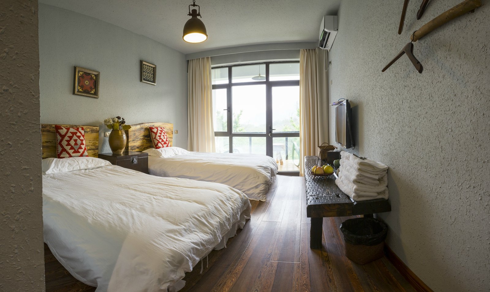 民宿的房间处处体现了人文之道,实木家具摆设,进屋后登上木制的地板才能到达床的位置,让睡眠空间与洗手间有了合理的界限,就连屋内的衣架都是实木制作可见精良非同一般,床上用品也十分舒适,壁挂电视来点生活噪音也是一种不错的选择。