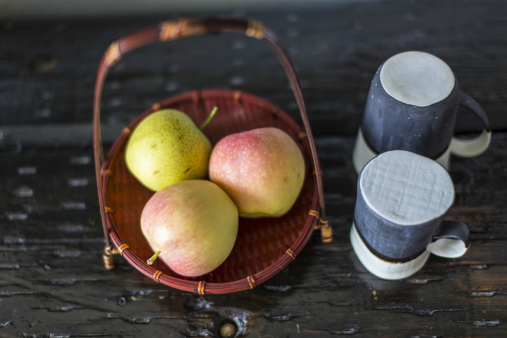 为每个房间准备的水果也透漏着老板的自然清新,不过这都是在我吃了个梨子之后的照片了,茶杯的色系与造型与整个房间的格调也很搭配。