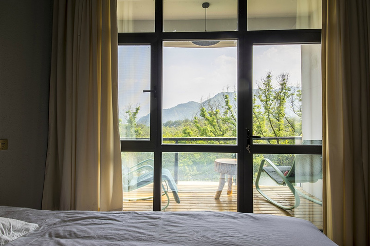 一侧是缓缓流淌的楠溪江,依靠山野间,夜里走出屋子就能看见满天繁星,走进屋内则是一片田园自然风情,每个房间无一例外全部带有阳台,为你提供了一种观赏楠溪江的绝佳方式。