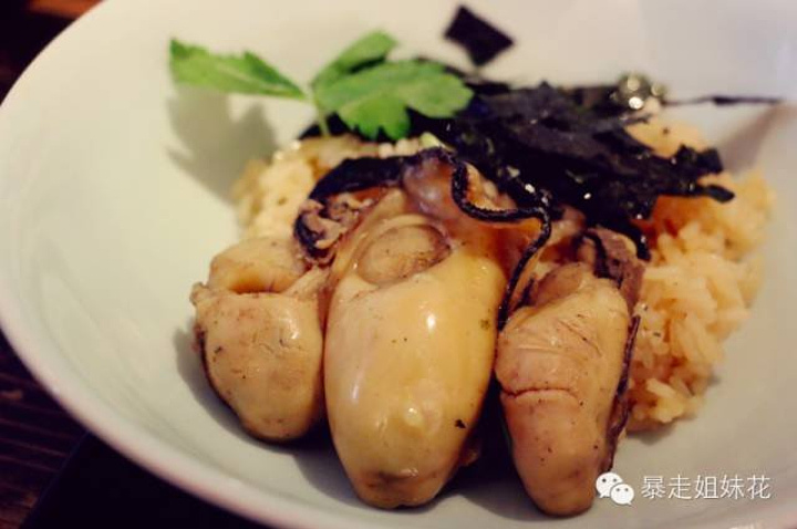牡蛎饭。最上面的是烧汁焗牡蛎,连同酱汁一起盖在米饭上,光是三颗牡蛎就已经占了大半盘的面积,米饭拌了酱也是香浓好味。