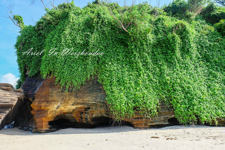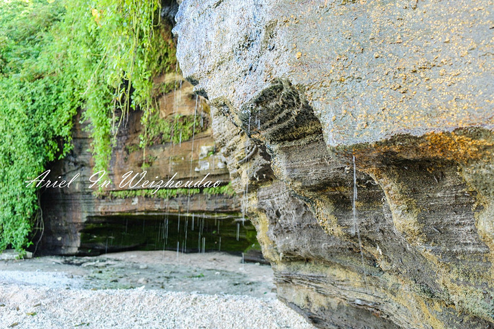 涠洲岛特色景点之五:滴水丹屏。断裂的绝壁间隙中不断有水溢出,往下滴,因此得名“滴水丹屏”,而且滴下来的是淡水哦(是的,我尝过了),绝壁的对面就是沙滩和大海,是欣赏夕阳的好地方。