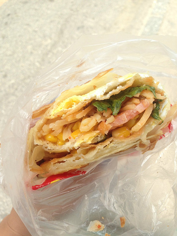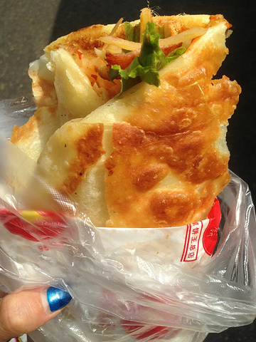 这是自己走到一个市场里看到很多人排队买的灌饼,而且是舌尖上的中国推荐过的,虽然吃了小丸子但是还是想尝尝,果然和我以前吃的煎饼果子不一样,而且实惠好吃。名字就叫灌饼王就在大连商场对面的一个小市场里,推荐大家去吃,巨好吃!!!