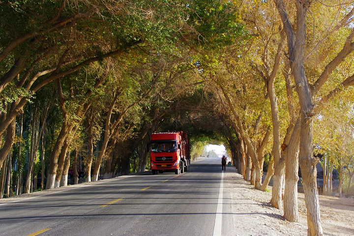 前方出现了大片绿洲,若羌县城就要到了。穿过两侧高高的树木搭成的隧洞,我们驶入若羌县城。