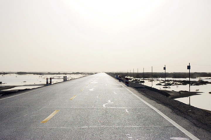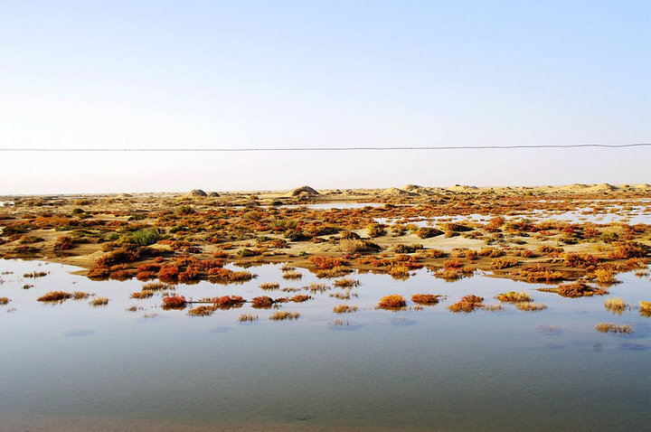 继续往南,距离若羌县城已经不远了,路边出现了大片的沼泽,是塔里木河的水流到这里汇聚而成,公路笔直地从沼泽中穿过。