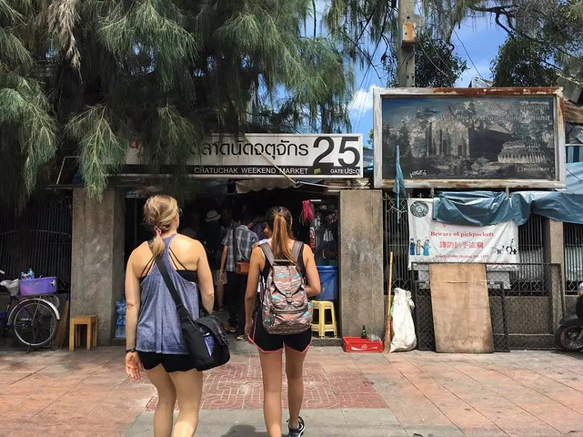 记得如果去周末市场的,要算好时间,因为只有周六日才开。周末市场从外面看一点都不起眼,我进去的门口只有那么一丁点,里面据说有1800间小商品店!真的很大,东西应有尽有。大家可以在那里淘自己喜欢的东西~我是坐公交车去的,但是泰国的公交牌都是有车号,没有站名的,要靠自己动口问人哦,泰国的人民都是非常友好的,会很热情的回答你~在周末市场淘了条裤子,非常舒服~很多外国人在那边都是穿着这裤子,配件t,穿对拖鞋就开始逛了~~买好自己想买的就回到旅馆了,中午休息了一下,晚上就去了考山路,因为晚上的考山路才热闹啊!有酒吧,小吃,马杀鸡~~