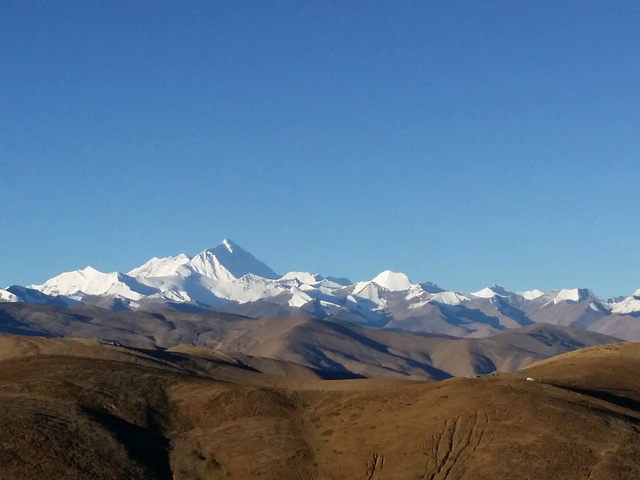 安睡了一晚,司机大哥载着我们抄近路,走了新修的下山马路,似是有神眷顾,奇迹般的我们看到了珠峰的全貌。