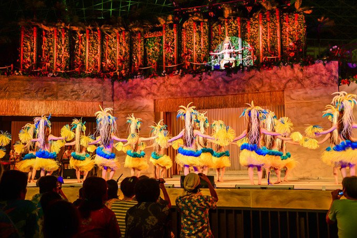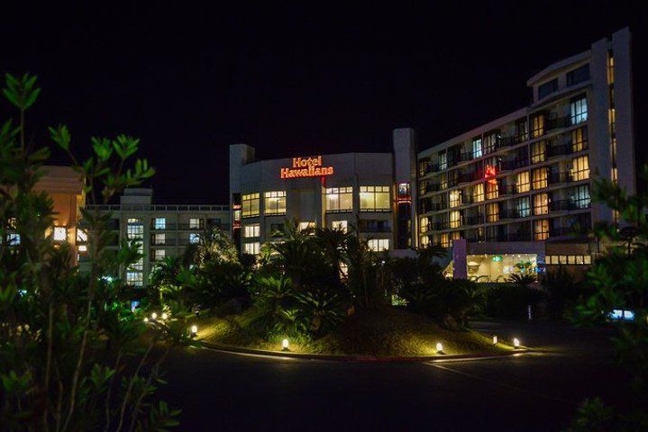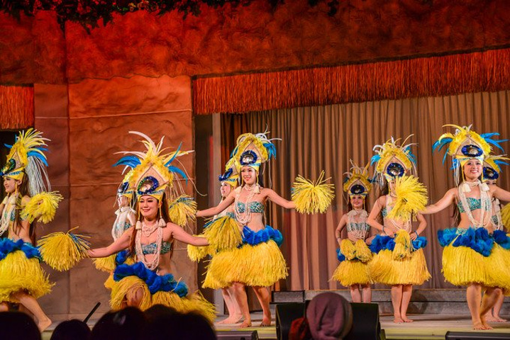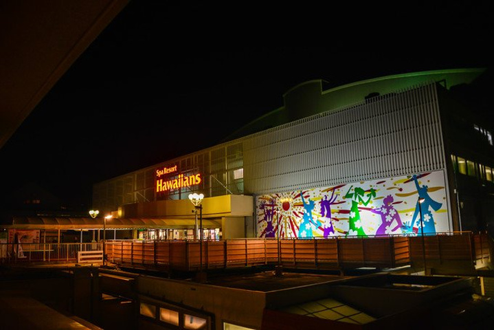 晚上7点20,酒店用车把我们送到了充满故事的 SPA Resort Hawaiians,现在这里已经是一家超大型的复合温泉酒店,酒店恒温28度,虽然增设了极具规模的五大温泉乐园还有各种水疗设施,但最吸引人的还是每天中年和晚上那热力四射的夏威夷草裙舞秀。
