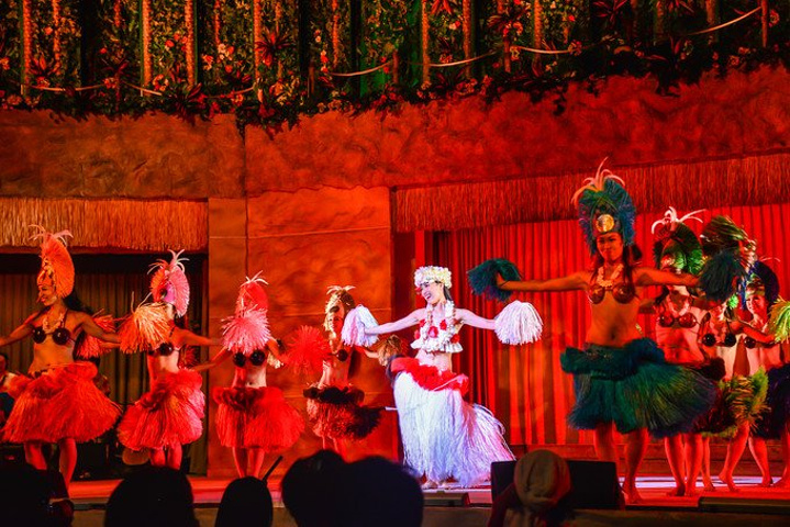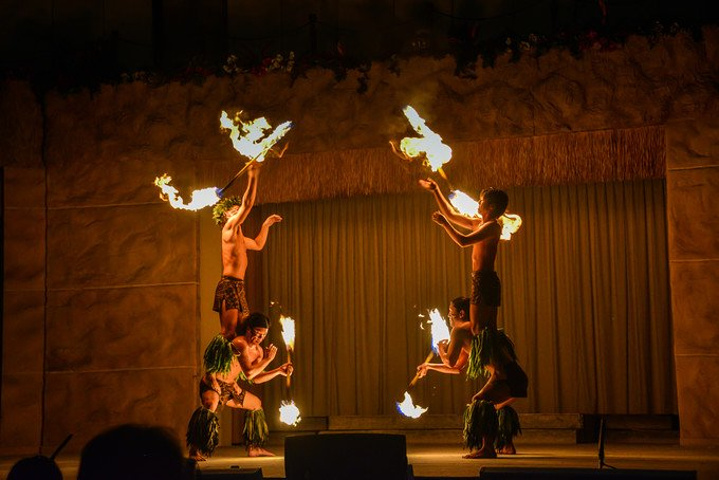 火把舞,这是夏威夷原住民赞颂火山女神的舞蹈,在疯狂的原始呼号中,脸上涂着各种色彩的“土著人”,在黑暗中舞动火把,甚至用手和嘴去触摸火焰,引得观众不时惊呼。