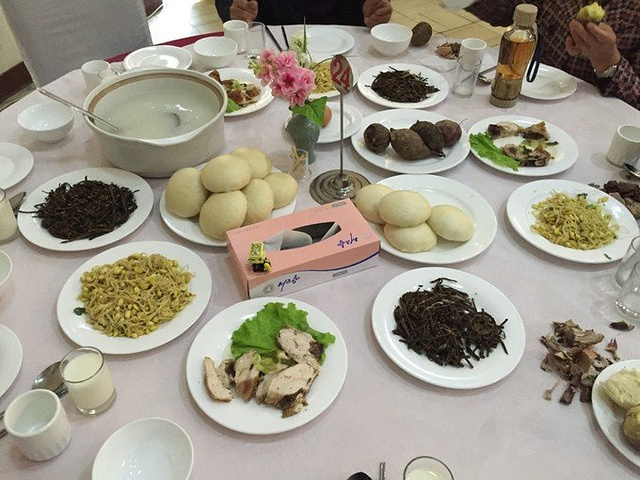 早餐仍是十分丰盛,还有好吃的小打糕。昨晚李进明导游说,今天要下午两点才吃午饭,让身体不好的人自己准备点零食。不像有些人一路吃过来,我其实没带什么吃的,包里就一小块米饼,一小块巧克力。于是把早饭我那份吃不下的煮鸡蛋、地瓜和馒头都拿了装包里备着,这回妥妥的饿不着了。煮鸡蛋和地瓜是按人数上的,每人一个,馒头有很多,所以我号召(撺掇)大家把馒头都分了装走,别中午挨饿。还自嘲了一下:不知道朝鲜人看了这景象会不会觉得中国人都饿得吃不上饭了,嘿嘿嘿。