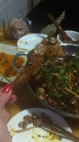 彩灯公园往回走一点就是东方广场,附近全是商业街,快速换上新鞋,久久姑娘已经发来信息说到了我挑的那家餐馆了。又要说我住的这个位置好,出门沿着河走一站到新桥这里,过了从前叫善后桥的那座古老又美丽的大石桥,就到了自流井老街。桥头有一家大众点评里口碑还不错的店,叫做老街兔。自贡就是吃兔子最出名。果然羞涩的久久姑娘已经在桥头等我了,落座一看:招牌鲜锅兔,兔腿,还有下酒的花生和雪花啤酒。