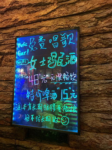 有一条商业街,各种卖东西的。有个酒吧的招牌,觉得还挺有意思,拍了一张。