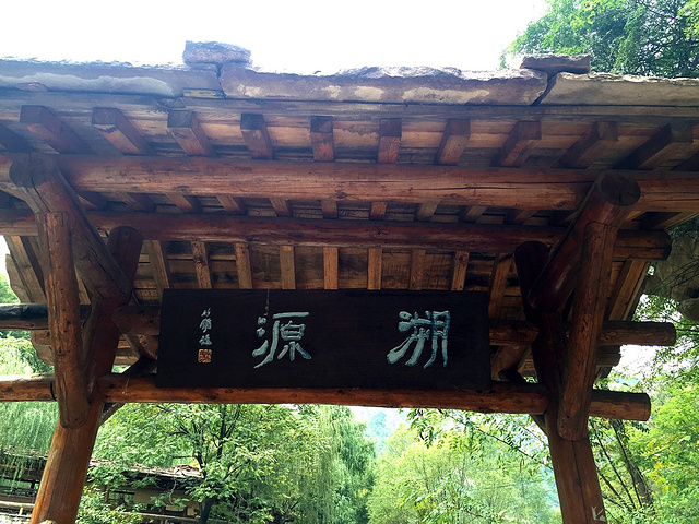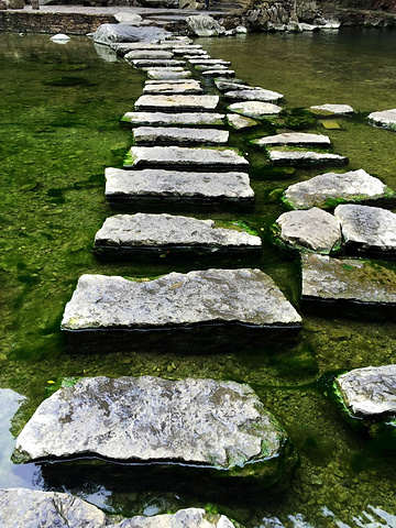 进入景区就是一片开阔的碧湖,碧湖上是浸在水中的石板路。