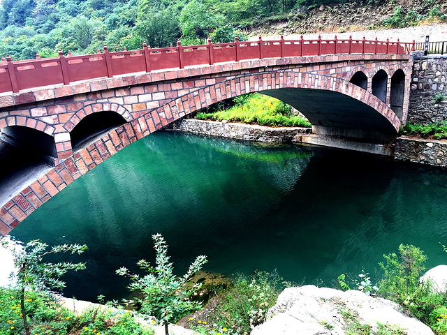 景区门口,是一座红色长桥,一抹碧绿穿过桥底,相映成辉。
