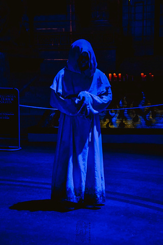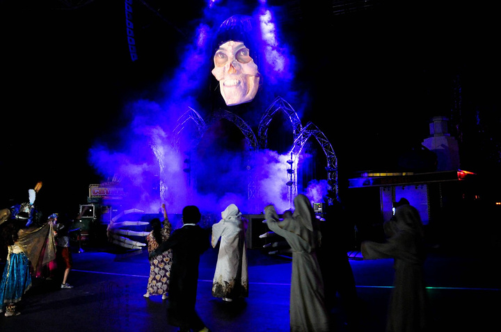 在正式探险鬼屋之前,有一个舞台的开幕式。一开始有很high的DJ,后来就出现了巨大的骷髅造型,连带着出来了很多“游魂”,加上火焰的喷射,和巨大的声响,把现场的气氛推到高潮。在一声巨大的鸣爆声之后,一群“游魂”突然冲向了观众区,吓得很多人惊叫连连。而与此同时,我们的万圣节惊魂夜也就正式的拉开了帷幕。