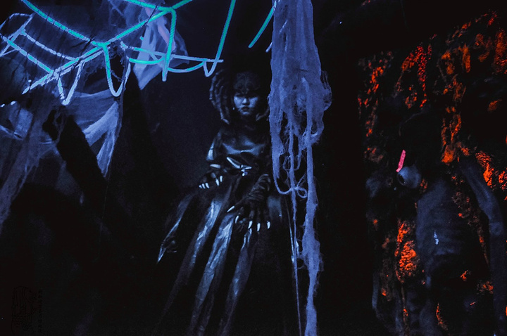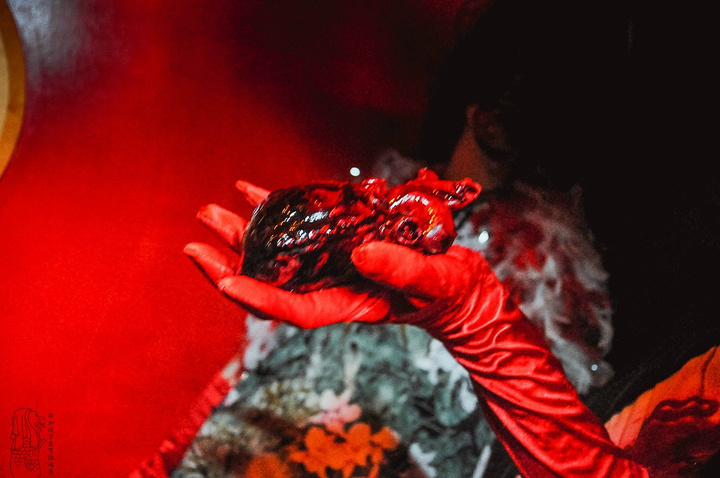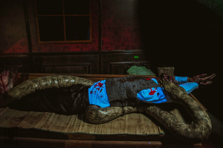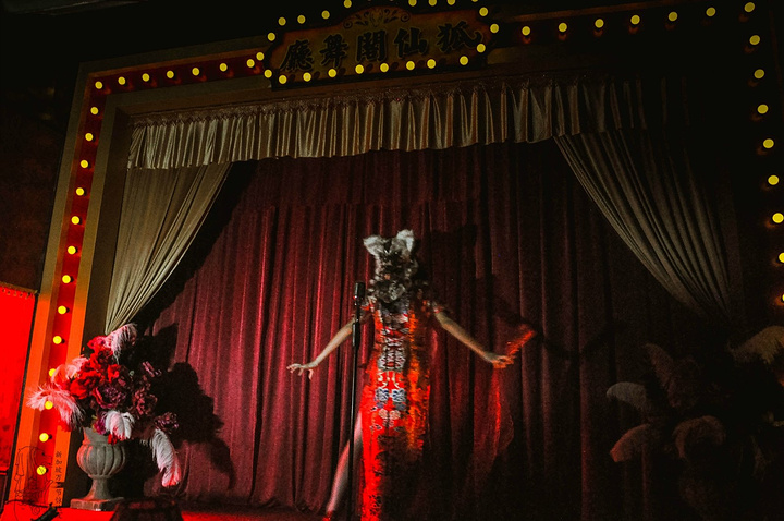 走过满是幽灵的大街,我们第一个到达的就是“胡姬客栈”。一开始在门口我们都觉得海报上的照片美女挺美的,慢慢走近后,整个人仿佛掉进了上世界30年代的老上海里。耳边充斥着《大上海》的歌谣曲调。进入室内灯红酒绿的,还有舞女在台上唱着大上海。来来来,跟我一起唱“夜上海,夜上海,你是个不夜城。。。”不过如果你以为这只是单纯让你歌舞升平的那你就错了。一阵妖笑过后,你会看见一只露出狐狸尾巴的狐仙在舞台上对你大笑。而台下原本听歌的男客都会惨死于狐仙之手。行了,该跟着我走进去了,待你们看一看这个鬼屋是怎样的场景。