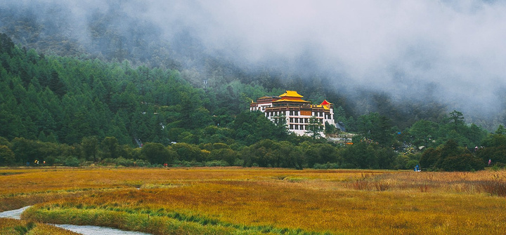 上山有景区区间车,包含在第一次给钱的270里面了,旅游大巴,大概要开40-60分钟的样子。我们一路上能见度很低,到处雾气弥漫,有的地方能见度甚至不到30米,绕着山开啊开的,有的路段还在下雨。到了亚丁村是第一站,放了一些乘客下来,有的旅客预订了亚丁村的住宿,基本你住在哪里就哪里放你下去。我粗略的看了一下,亚丁村有很多新的房子再建,估计也是要投入使用的客栈之类的,然后吃的基本都是客栈兼吃饭,反正就是山沟沟里的小村庄吧,我们没有在山上住宿,条件不知。