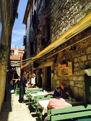 古老的石板街道。两边尽是纪念品点和餐馆咖啡厅。