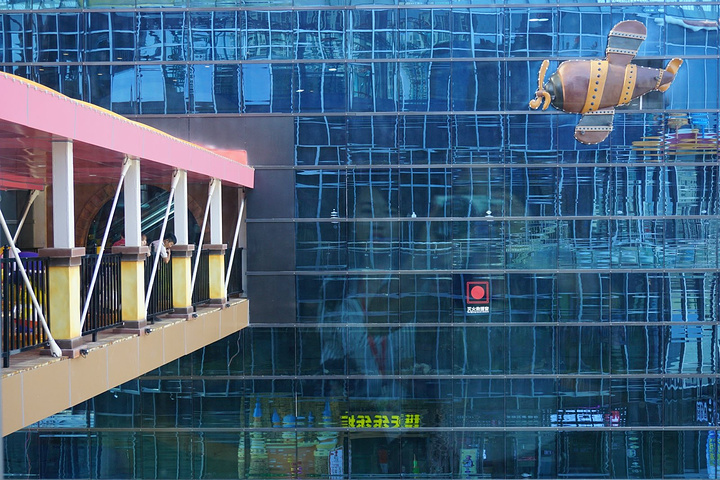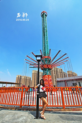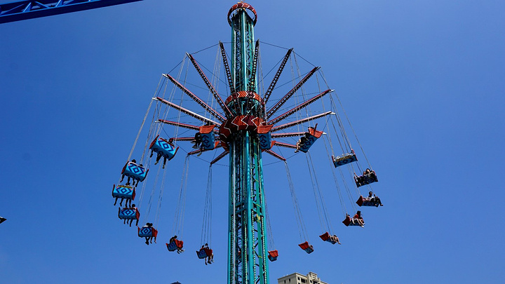 好了,这个超级大秋千,我来了!为了安全起见,被迫放下了身上所有的行头:相机、帽子、太阳镜,工作人员过来给我们一一紧上锁扣,检查完毕后,我们就开始转起来啦!慢慢地越升越高,我们就在茂险乐园的大楼顶端飞起来啦!高楼都在我的脚下,耳边呼呼作响,我就在蓝天里飞翔,离白云那么近,就看着一缕缕白色在一片碧蓝里流转,风景不要太美,心里不要太怕,特别是被甩出大楼的时候,感到自己手脚心都在出汗,害怕得喊不出来,这份刺激的美丽实在有点难以承受,终于,我们被慢慢的降下来了,有一种重返陆地如释重负的感觉,落地后我居然不能打开锁扣,然后工作人员过来用专用钥匙才打开,对这个安全措施,我很满意!惊吓度:4颗