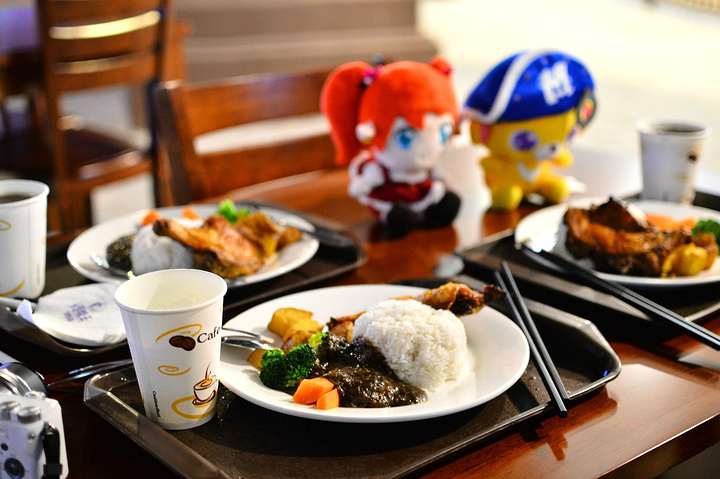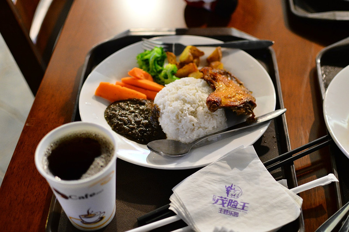 买好食物,我们拿好餐盘就找桌凳坐下,美女服务员把我们的鸡腿餐上面,浇了好多黑椒汁,让我们一起开启美味吧!小贴士:饮料不可以续杯的哟,所以宝宝们拿饮料的时候把杯子装满吧!