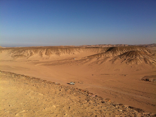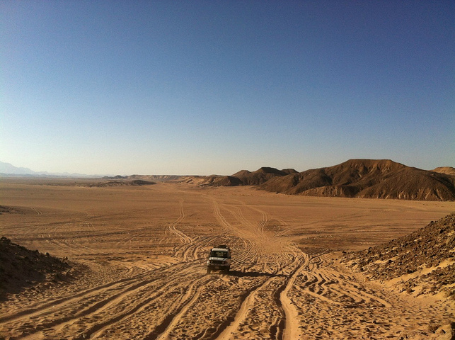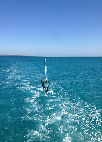 第六天,行程过半。为了更深刻地感受赫尔格达“一半是海水,一半是沙漠”的奇观,我和王先森决定参加出海和冲沙。出海主要活动是浮潜,说实话,我对浮潜真心害怕,王先森则是势在必行,想想当年蜜月在麻袋没浮潜的遗憾,我暗下决心一定不能再错过红海,克服了恐惧发现海底世界真的很美好,绚丽的珊瑚,多彩的小鱼,如果是深潜应该更美吧。我和老公都被珊瑚“亲”到了,他望而却步,我却浮潜上瘾,第二次下水看到的景色更美。在游艇吃着午餐,和老公赏着红海,水真的又清又蓝。重头戏是下午的冲沙,以前只在电视上体验过有多惊险,胆小的我心里多少还是有点忐忑的,但来到撒哈拉沙漠,没有亲自走到沙漠腹地里感受一下,总觉得心有不甘。我们六人面对面排排坐,车没开多久哈比比说已经开始了,随着吉普车的冲力,时上时下,如过山车般惊心和刺激,简直就是去沙漠深处探索和体验茫茫大漠的感觉。吉普开到沙漠深处停下,双脚终于踩上撒哈拉大沙漠的土地,风大得快要把我吹跑。放眼望去一片茫茫大漠,绵绵不绝。这就是传说中的撒哈拉吗?以前觉得它遥不可及,现在却真真实实地感受到了它!心中涌动出一股莫名的激动,一望无垠的黄沙令人神往不已。突然想起三毛,她与荷西的爱情仿佛就流淌在眼前这片滚滚的黄沙里。哈比比带领我们爬上一面高坡,这里的黄沙绵细松软,其实撒哈拉沙漠里真正的沙地只占全部面积的20%,沙地之外,还有砾漠和石漠,三种地形镶嵌分布。所以撒哈拉是沙质荒漠,沙粒粗细不匀且夹杂小石子,属于非流动性沙漠。随着吉普车,我们进入了沙漠深处的贝都因村落。这里有5头骆驼供游客轮流骑走,每头骆驼由一名当地贝都因人牵着。骆驼是沙漠之舟,在撒哈拉大漠里骑着骆驼在阳光下行走,感觉超爽。骑在高大的骆驼背上,望着眼前的茫茫戈壁,笼罩在寂寥,苍夷和荒无人烟中,有一种莫名的凄凉悲壮感。几个贝都因小孩围着我们,眼神清澈,特别可爱。这里一个家庭有好几个孩子,大的带着小的。他们的父母忙于生计,不能给他们细心的呵护和照料,更谈不上文化教育。看着这些可爱的孩子们,我不禁为他们的将来担心。是走出沙漠还是一辈子守着原始的生存状态?我们来到贝都因人家做客,看当地人烙饼,参观贝都因人的纺织工艺品,在简陋的纺织机上用驼毛和羊毛混合织成的挂毯。参观贝都因人的家,原始简陋得令人难以置信。隔墙是用香蕉树茎叶围成的,屋内没有桌椅板凳,没有床,地上铺着几张用骆驼毛编织的粗糙毯子,可能就是他们的栖身之处。用“家徒四壁”来形容一点也不为过。在撒哈拉这种恶劣的环境中,贝都因人是如何生存下来的。哈比比带我们去到一个挖得很大很深的平台,平台中间有一口深不见底的水井。朝黑洞洞的井口往下望,谁都不相信里面会有水。在鸟都飞不进来的荒芜大漠,居然能打到井水!撒哈拉,人类生命的禁区里,生活着这个令人惊叹的民族。哈比比说他们很有钱,但是生活很简单。这些贝都因人远离尘世、远离文明,独守着自己的生存方式,在人类几乎不可能生存的地方生活劳作,繁衍后代。夕阳西下,大漠笼罩在淡淡的砂层中,天空不见晚霞,周围山川悄然无声,空气寂静得苍凉。只有远方一座被夕阳余晖抹红的山峦,朦胧似玉般闪发一些淡淡的光亮。此刻的撒哈拉,令人望而生畏。 黑幕渐渐降临,沙漠进入了黑暗的夜晚。这里物资贫乏,什么东西都受欢迎。对比我们,两相对照,差距太大了。在这里真切感受到什么是物资匮乏,什么是贫困,什么是爱莫能助。今晚要在沙漠中晚餐,沙漠里贝都因人的特色晚餐:烤牛肉,杂豆饭,皮塔饼,素菜撒拉。说不上好吃,只能说体会一下。好在晚上酒店的自助餐9:30才结束,真正的晚餐还得回去吃。吃完晚餐出来,车开至某处,一下车便看到了久违的星空。很幸运,今晚没有月亮。那么多的星星,如同无数颗耀眼的钻石散落在黑色的 绒布上,看到银河时我一直不敢确定,一直以为那是不存在的虚幻。只可惜没有专业相机,只能多把它看几眼深深地印在脑子里,和老公依偎在一起感恩生活给予的感动和馈赠。