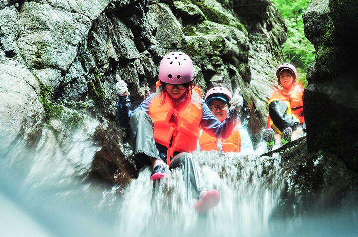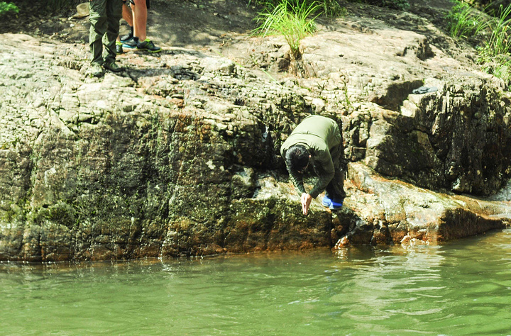 遇上深色的石头,会很滑,大家干脆坐下来,用屁股一点点挪......