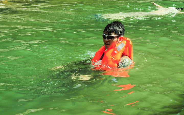 大家先逐步感受水温,在38度太阳的直射下,水里温温的。