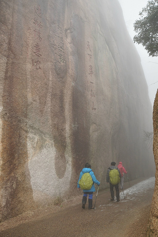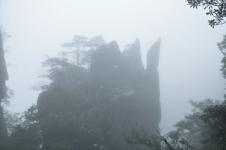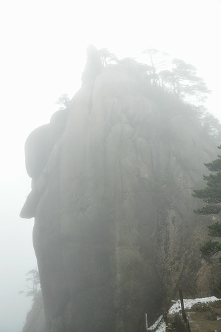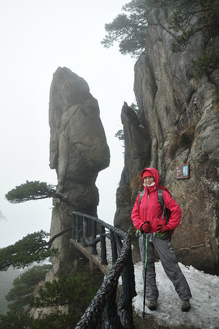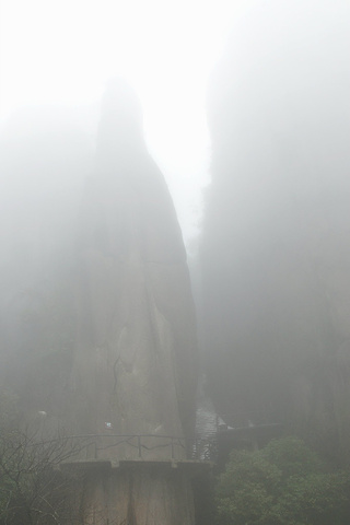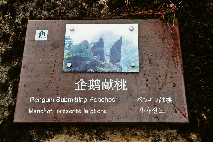依着山势缓缓前行,隔着深渊对望陷在迷雾中的奇石,这个是“企鹅献桃”。