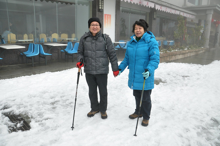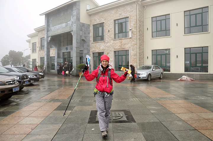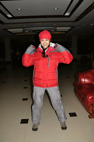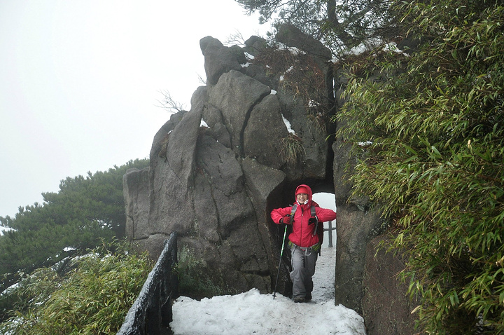 车行1个多小时后,我们于凌晨5点到达三清山南部索道,来到山脚下的假日酒店。笼罩在黎明前的黑暗中,好冷好冷,赶紧躲进酒店大堂,虽然没有暖气,但好在有大沙发供休憩,有墙壁挡寒风,有弱弱的灯光给人以灯火人间的暖意。春节,裹上红红的羽绒衣红红的帽子增添氛围。