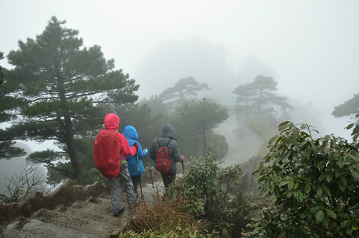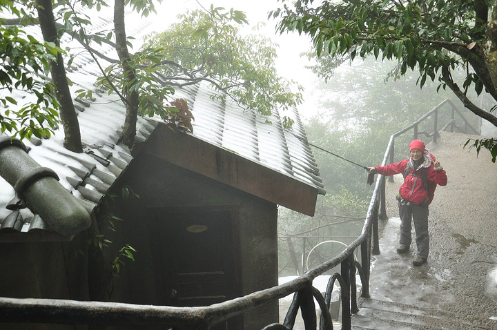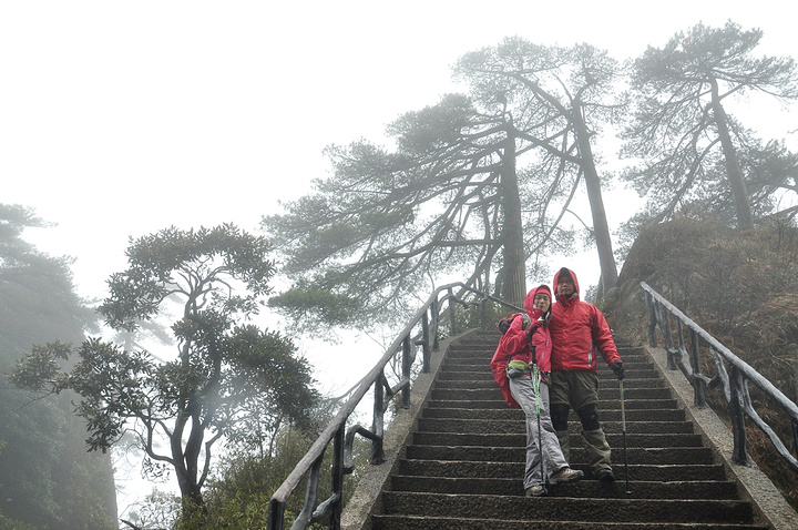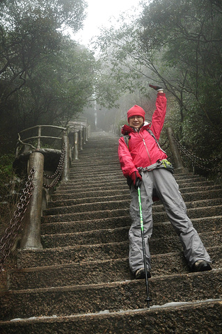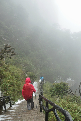 傍晚将至,气温渐降,山间开始飘起小雨,我们赶紧都带上帽子护身,继续下石阶前进!