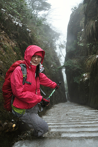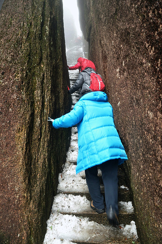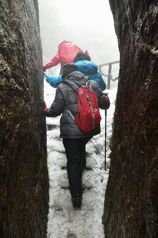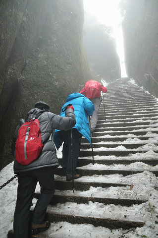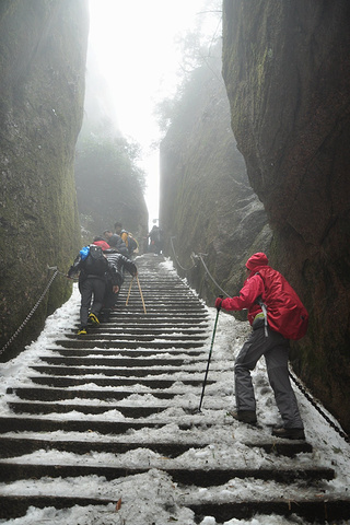 走过羊肠石阶,道路稍宽,但冰雪仍厚,小心的扶着铁索,滑溜着上行。