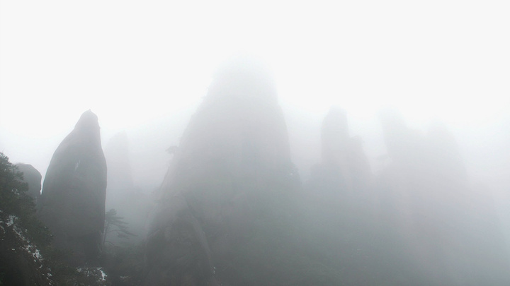 这是对面的冰雪山道,需要在垂直山壁搭建的石板路上,迂回走过蒙蒙迷雾,才能到达。