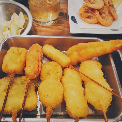 炸物,太好吃了,外酥里嫩就是形容这个的。酥脆的外皮里面是嫩嫩的,还带汁水的鸡肉牛肉猪肉。芝士、山药、茄子这类的炸物也好好吃。我们点了好几拨,最后结账也只要6000多日元,觉得好值啊!