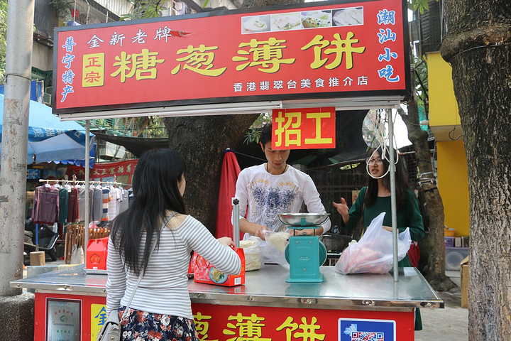 到点才出来售卖的好吃的糖葱薄饼,买了尽快吃哦,因为天气太热不利保存。